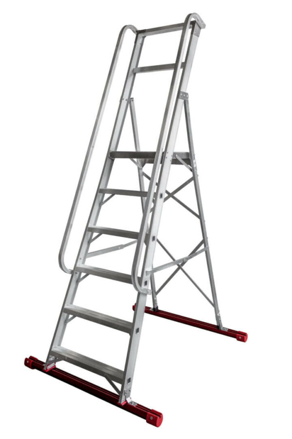 Kotimainen 6-askelmainen alumiinitikas joka vakautta lisäävien alatukipalkkien ansiosta soveltuu rakennustyömaille. Työtasossa pitävä rei ’itetty pinta.