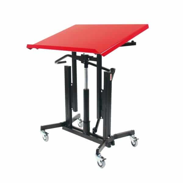 Siirreltävä apupöytä jossa monipuoliset säädöt. Teräksinen kallistuva taso kaasujousella ja ylöspäin taivutetulla etureunalla. Kääntyvät pyörät joista kahdessa on jarru.