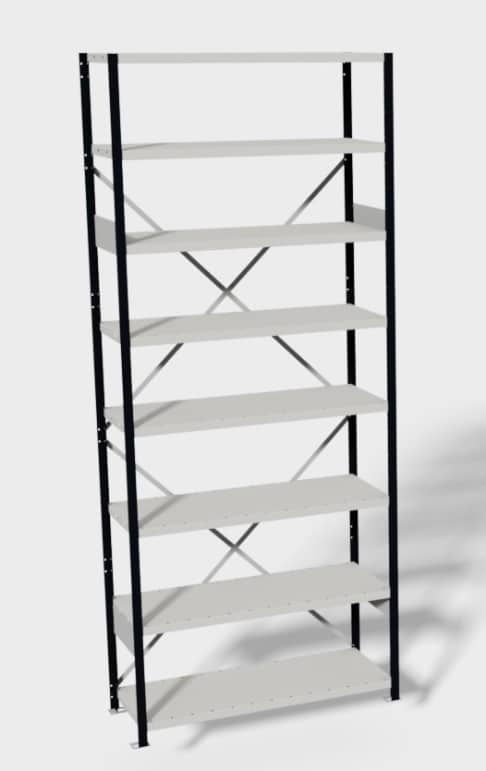 | Materiaali ja pintakäsittely | Teräshyllyt. Pulverimaalaus: Hyllytasot vaaleanharmaat, pylväät tummanharmaat. |