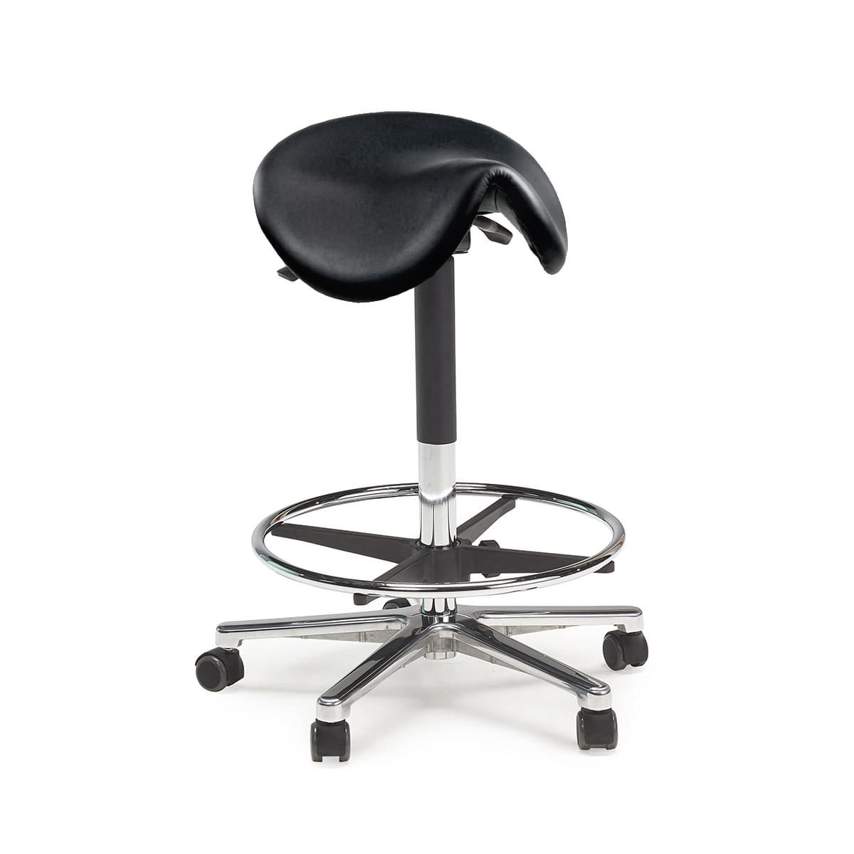 Suomessa valmistettu satulatuoli jossa istumakorkeus välillä 620 – 870 mm. Istuin aitoa nahkaa ja siinä on kallistuksen säätö. Jalkatukirengas vakiona ja pyörät jalkatukiristikossa.